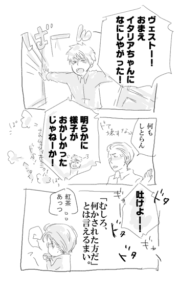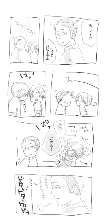 なんかまだ つづきそう。 ドイツはぷーにイタリアがらみでよくからまれてたらいいのにという妄想。 ドイツ家だしたら時系列がよくわからなくなってしまったけど雰囲気で読んで下さい。 つづきました/つぎのひ(click!)