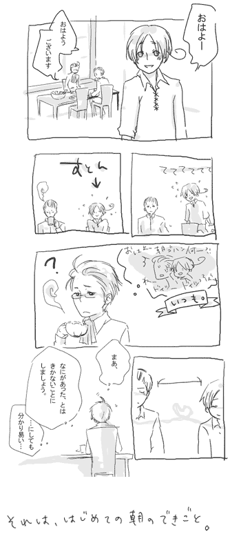 もっと近づきたいけどなんかだ恥ずかしい!みたいな。ていうかたぶんべたべたしたらドイツに怒られる!みたいなイタリアと極めて平静を装うドイツとかかわいいなーと思ってかきはじめた漫画。なにがばれてないのかはご想にお任せ!つづきます。(click!)
